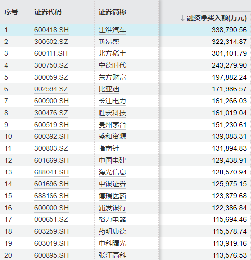 自6月以来,江淮汽车、新易盛、北方稀土等3只个股融资净买入金额超过30亿元。